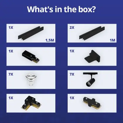 | Herstellername | Complete L shaped 1-Phase Track Set Black incl. 7x Spot fixture + GU10 2700K 3W Dim – 1,5 x 2 meter | |