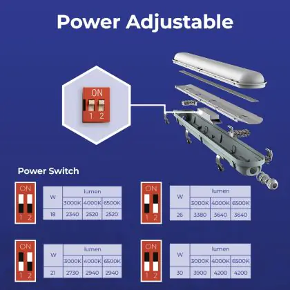 Die LED-Feuchtraumleuchte kommt mit der Farbtemperatur 3000K - 4000K - 6500K CCT daher. Als Faustregel gilt: Je niedriger der Kelvinwert, desto gemütlicher wirkt das Licht.